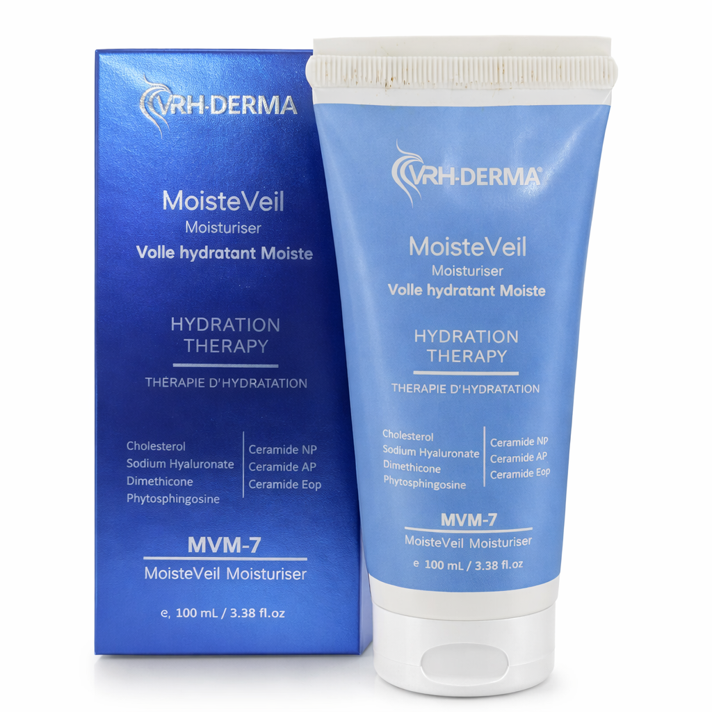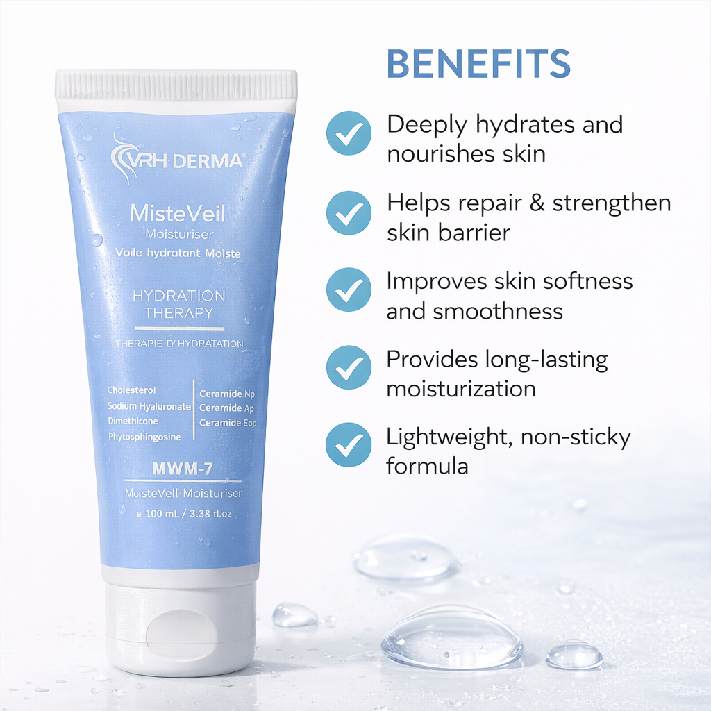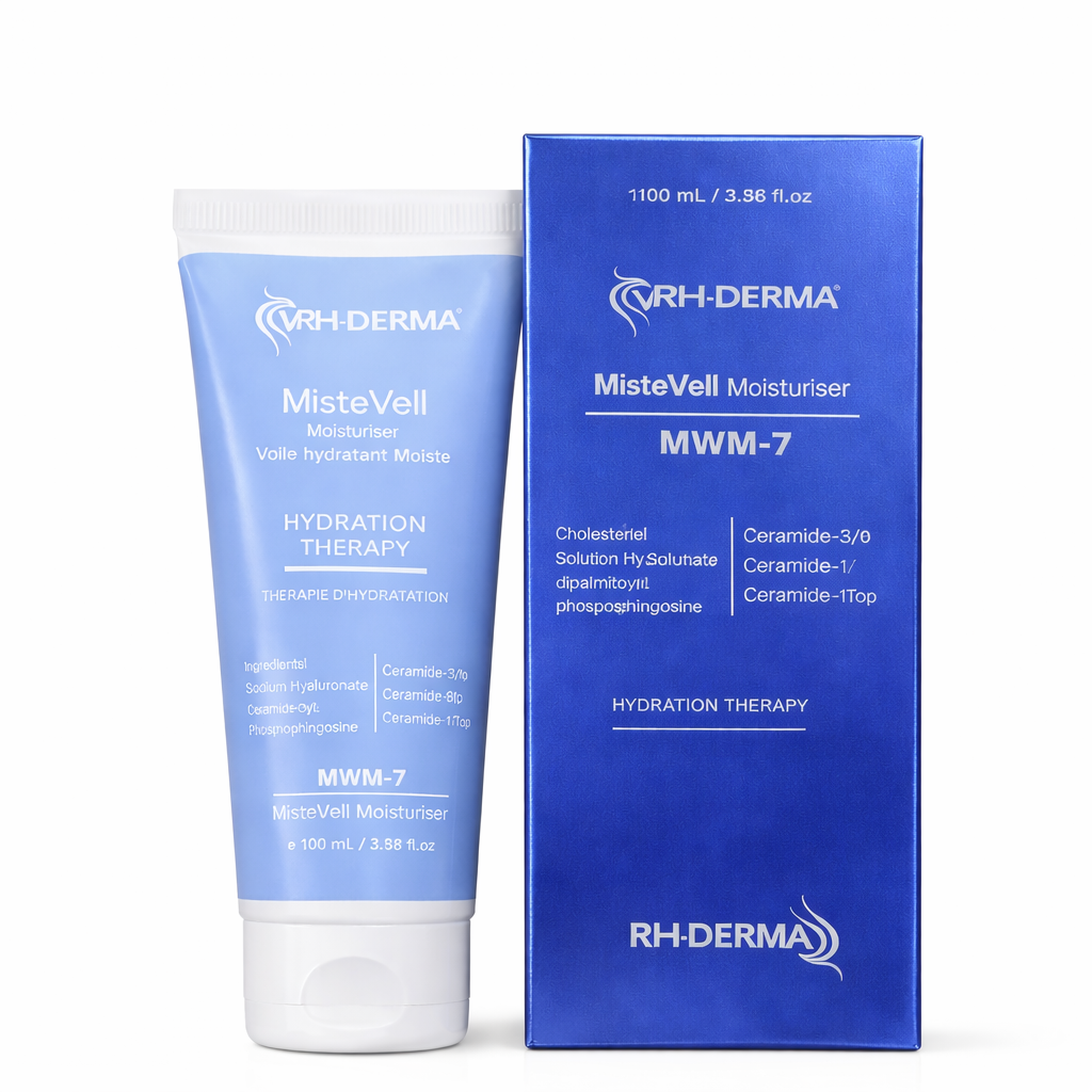 RH-DERMA MisteVell Moisturiser MWM-7 is an advanced hydration therapy moisturizer specially formulated to restore skin moisture, strengthen the skin barrier, and provide long-lasting nourishment. Enriched with Ceramides, Sodium Hyaluronate, and Phosphosphingosine, it helps repair dry and damaged skin while maintaining healthy hydration levels.
