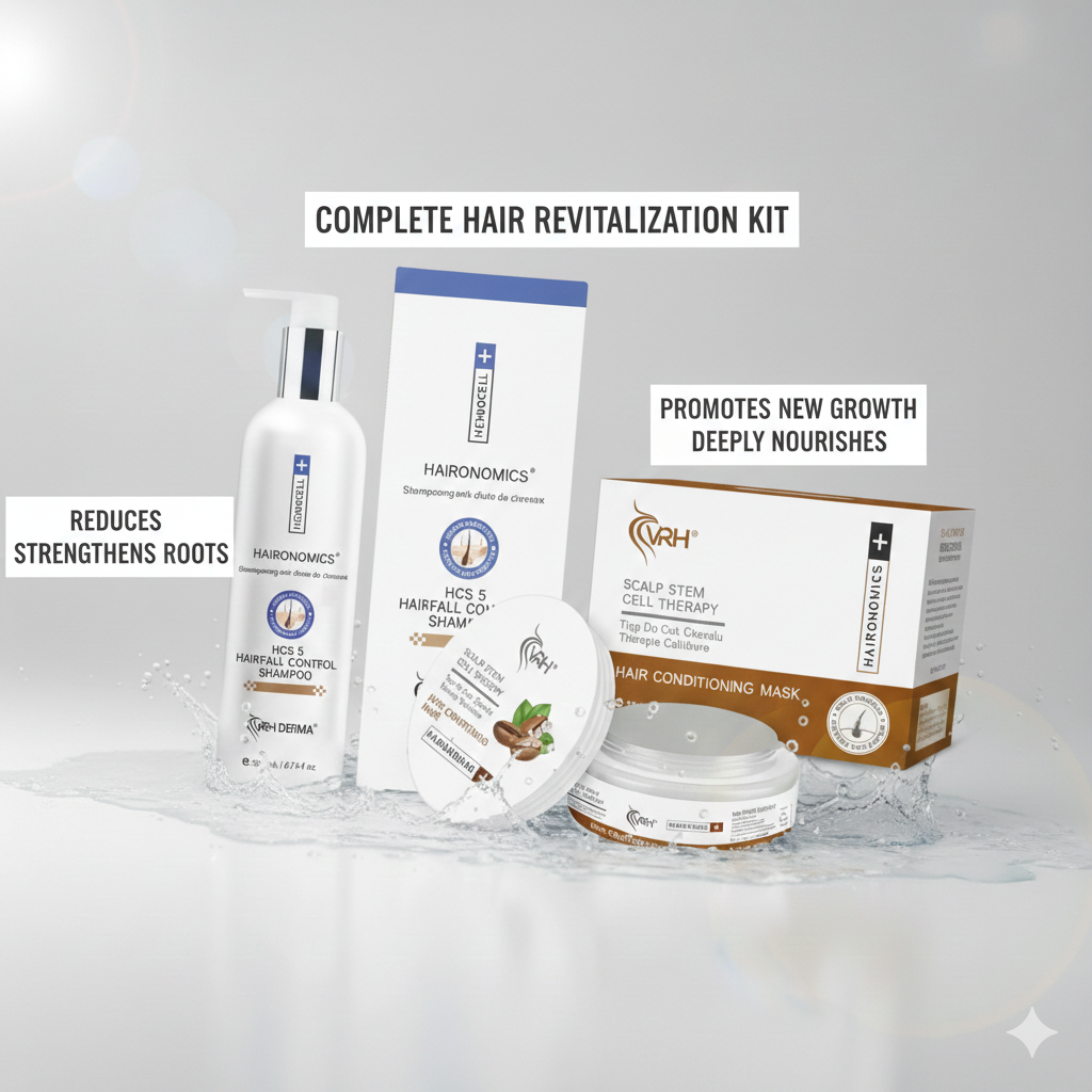 Say goodbye to hair thinning and dullness. The VRH Derma Hairnomics Revitalization Kit is a powerful two-step system designed to stop hair fall and deeply repair damaged strands. By combining clinical science with botanical extracts, this combo provides a complete "salon-at-home" experience.